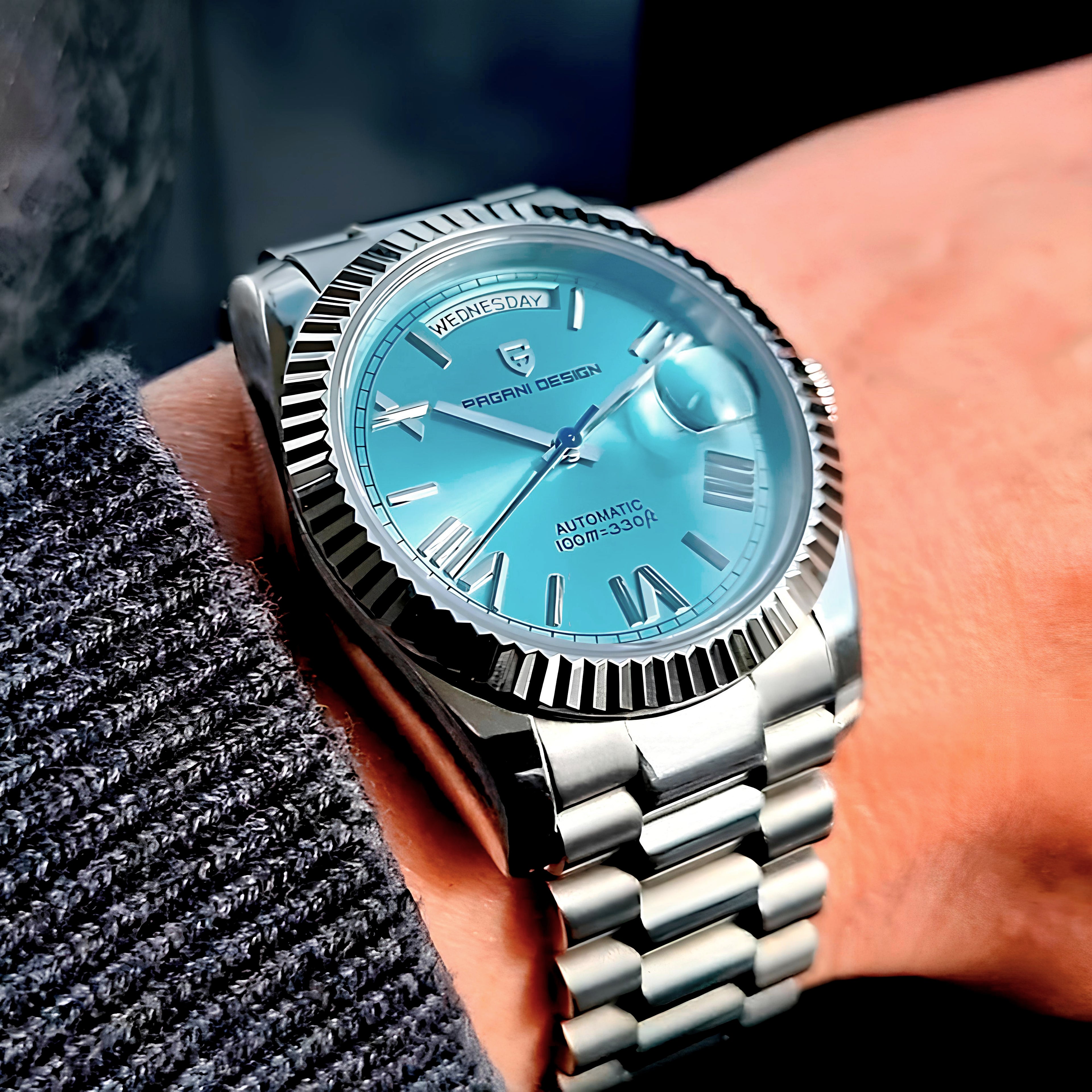 The Pagani Prestige is the definition of masculine sophistication. With a 316L stainless steel case and anti-reflective sapphire crystal, it combines durability with a refined shine. Powered by the renowned Seiko NH36A automatic movement and offering a 42 hour power reserve, it delivers precision and style for any occasion. The balanced 40 mm design and 10 ATM water resistance make it the ideal companion for those who demand more from time.
