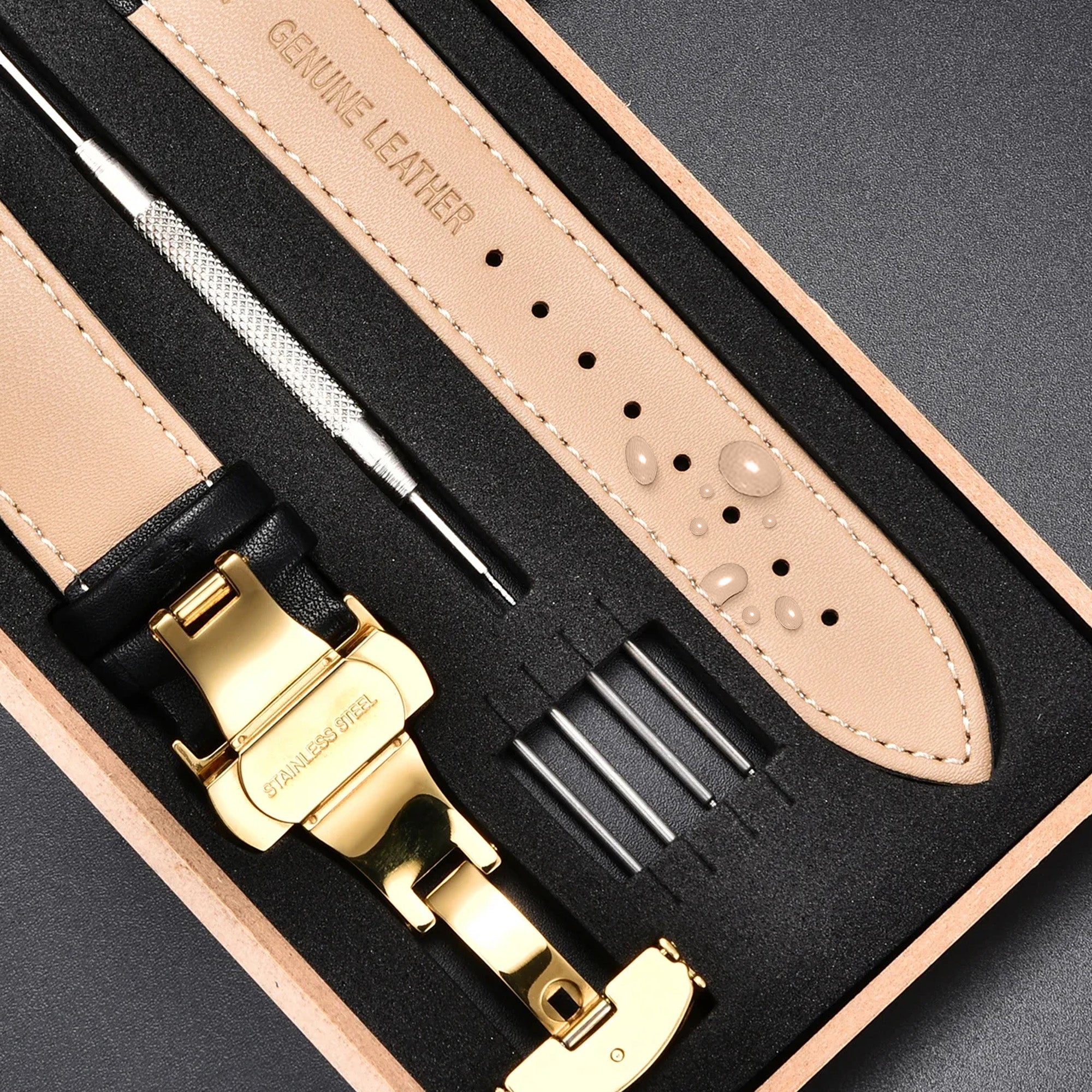 • Package includes: 1 leather strap, 3 spring bars, and 1 spring bar tool