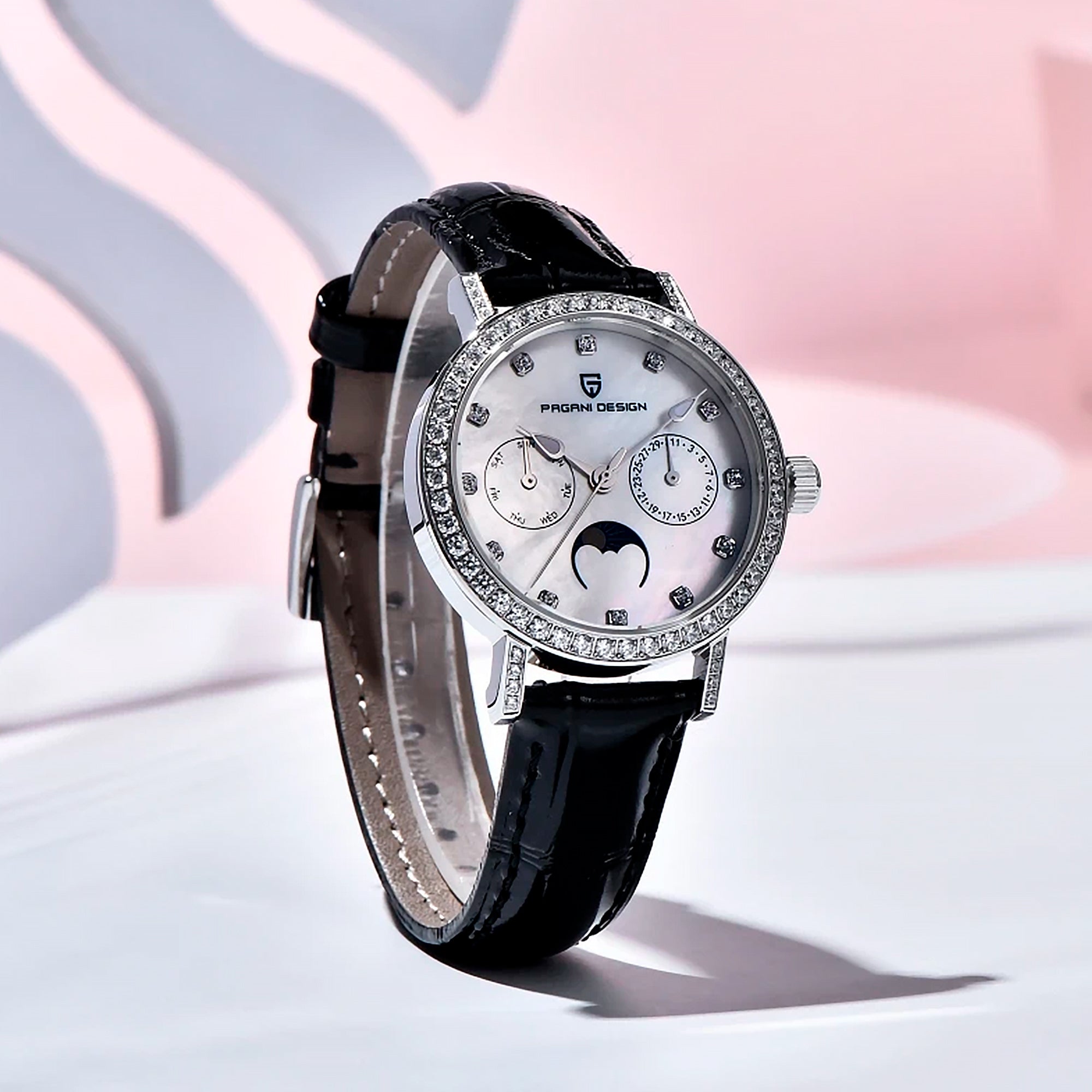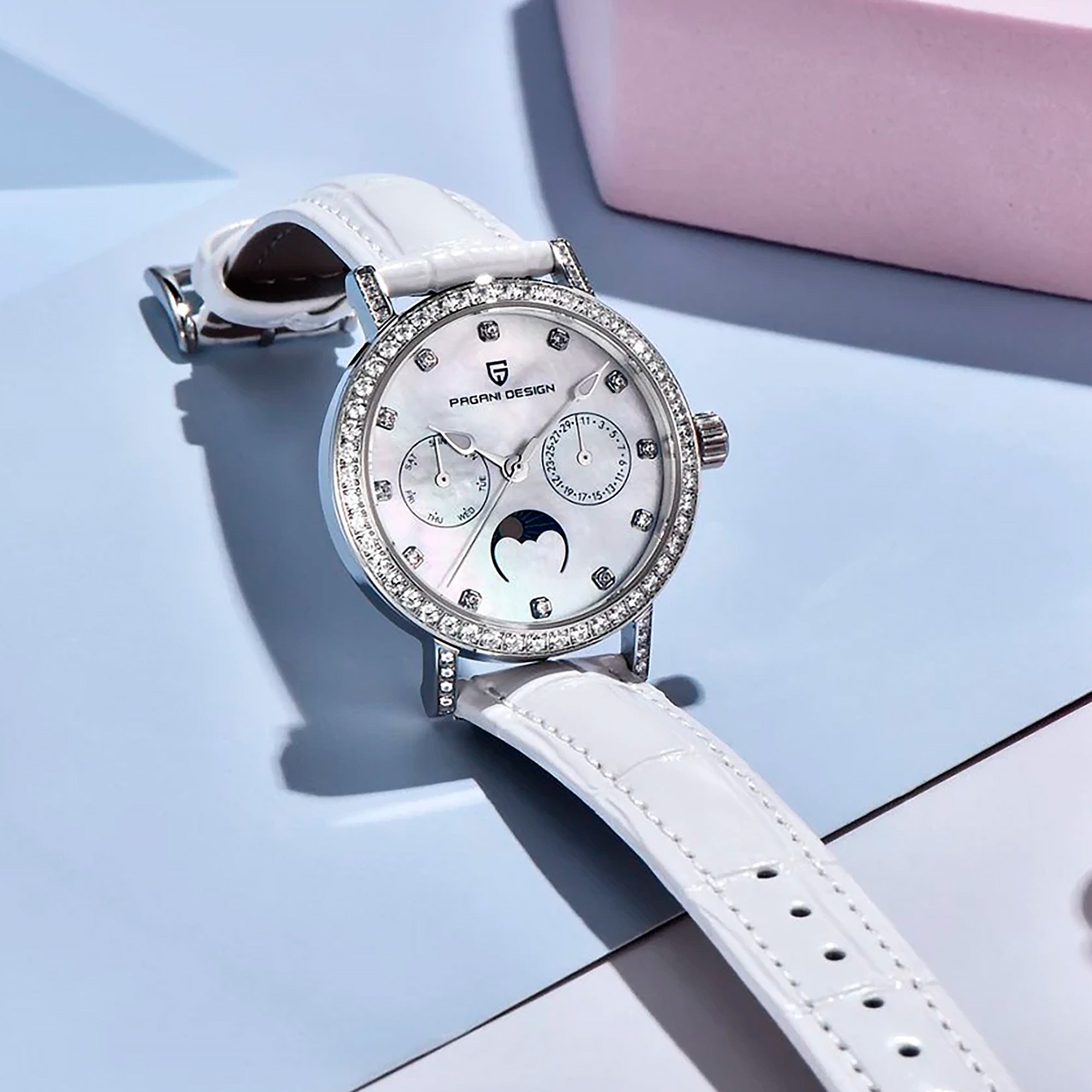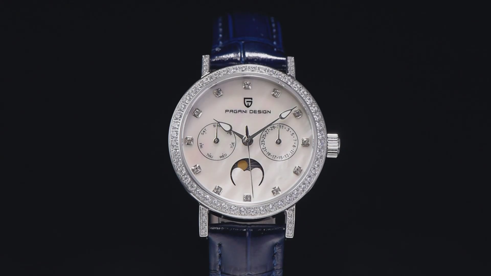 Embrace lunar charm with the Pagani Lunaris, where refined design meets precise functionality. Crafted with a 33 mm case in surgical-grade 316L stainless steel and a scratch-resistant sapphire crystal with anti-reflective coating, this feminine timepiece exudes delicate strength. The dial features moon phase, day, and date complications, a graceful tribute to the rhythm of time. Powered by the EPSON VX3HA quartz movement and water-resistant up to 100 m (330 ft), the Pagani Lunaris is more than a watch, it’s a 35.7 g functional jewel that brings timeless sophistication to every moment.