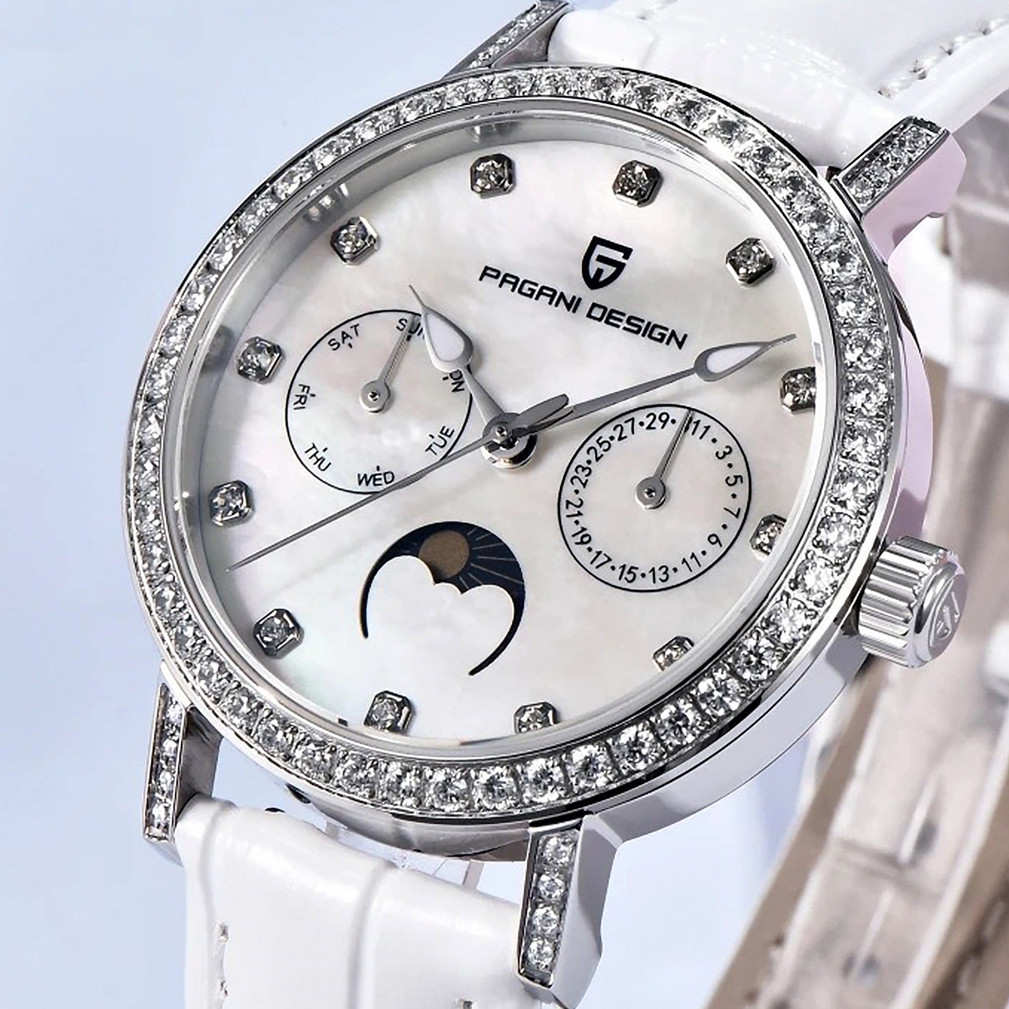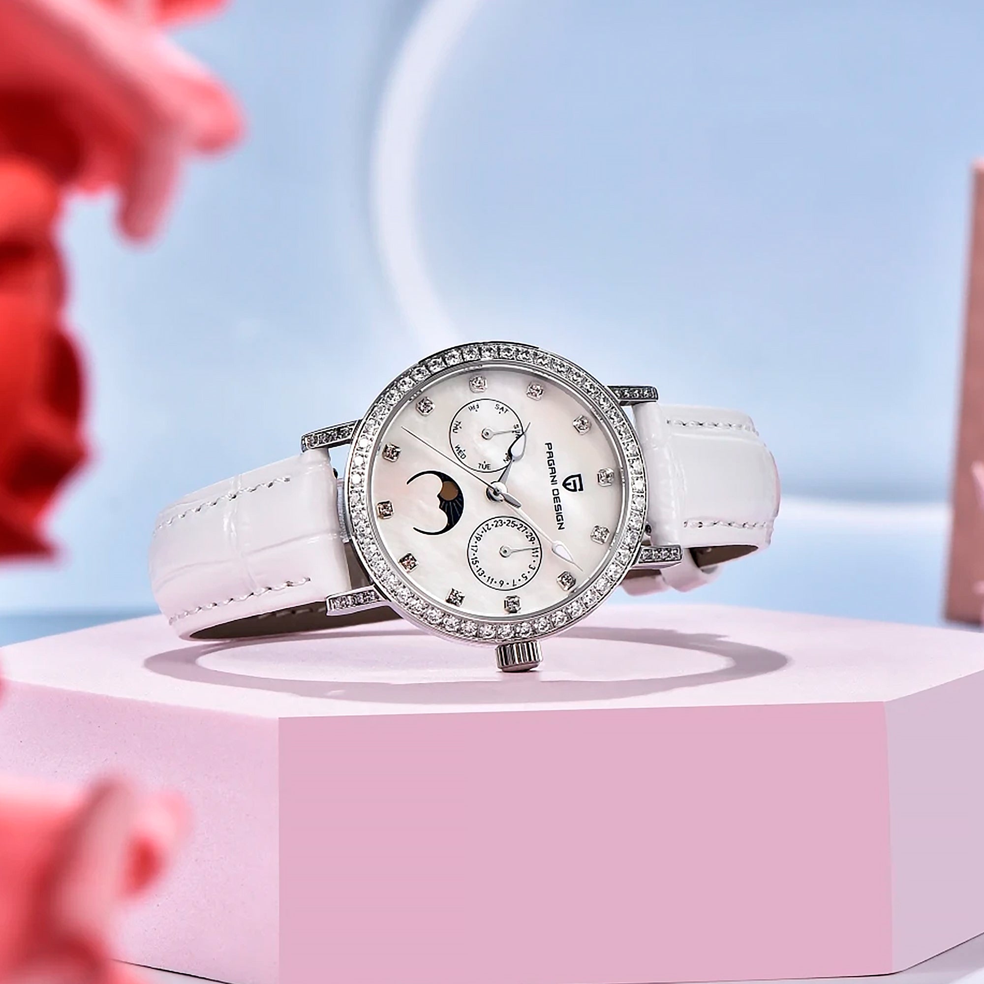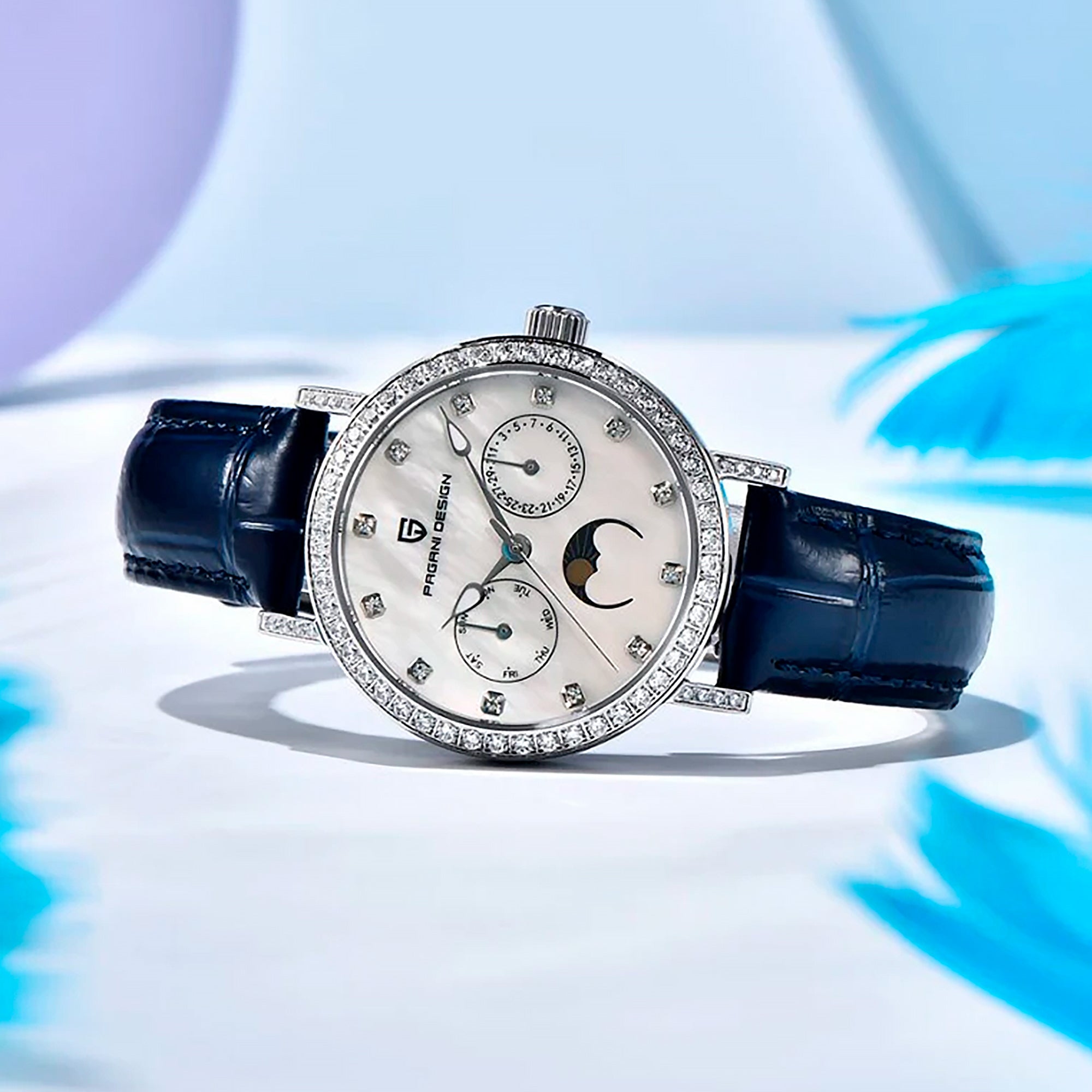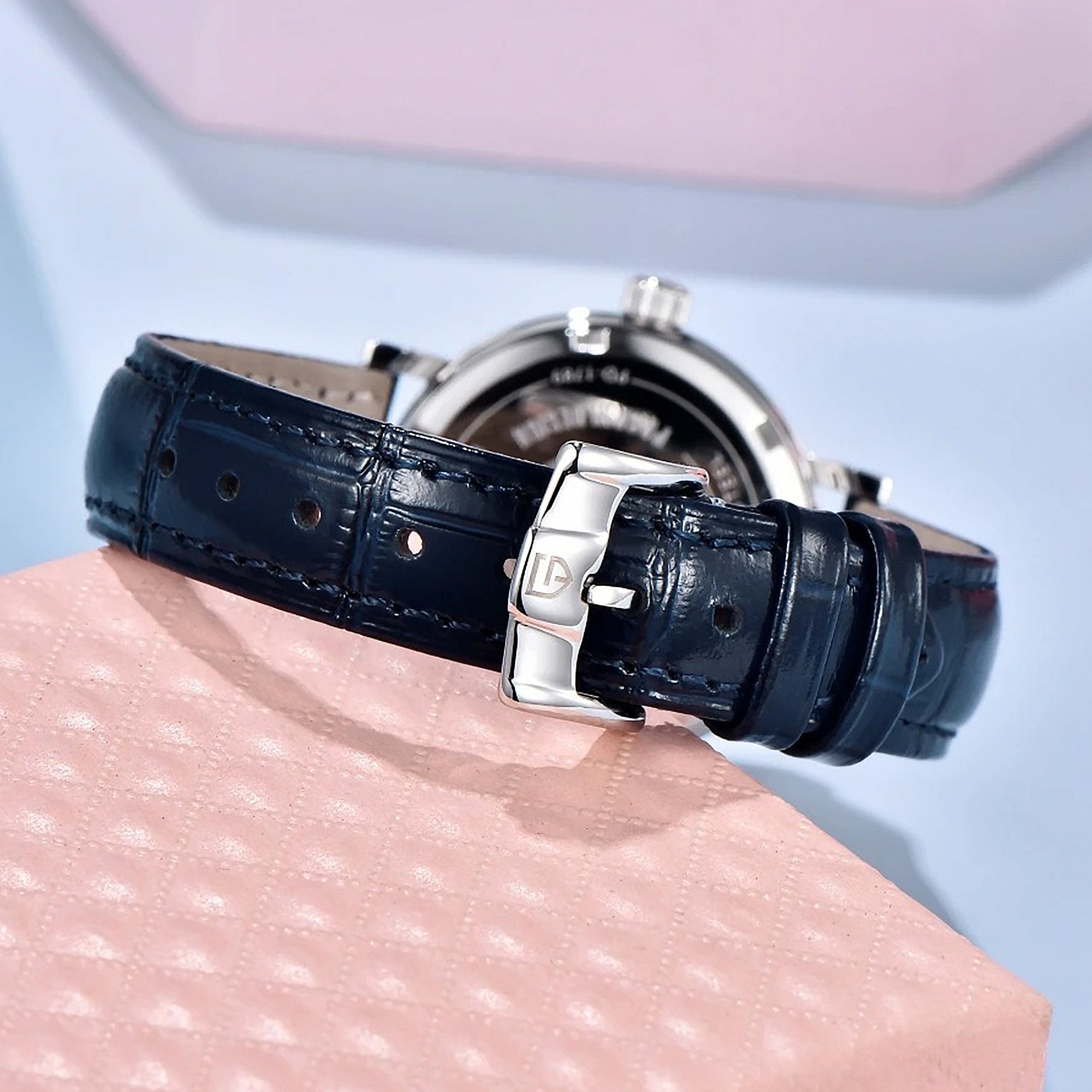 Embrace lunar charm with the Pagani Lunaris, where refined design meets precise functionality. Crafted with a 33 mm case in surgical-grade 316L stainless steel and a scratch-resistant sapphire crystal with anti-reflective coating, this feminine timepiece exudes delicate strength. The dial features moon phase, day, and date complications, a graceful tribute to the rhythm of time. Powered by the EPSON VX3HA quartz movement and water-resistant up to 100 m (330 ft), the Pagani Lunaris is more than a watch, it’s a 35.7 g functional jewel that brings timeless sophistication to every moment.