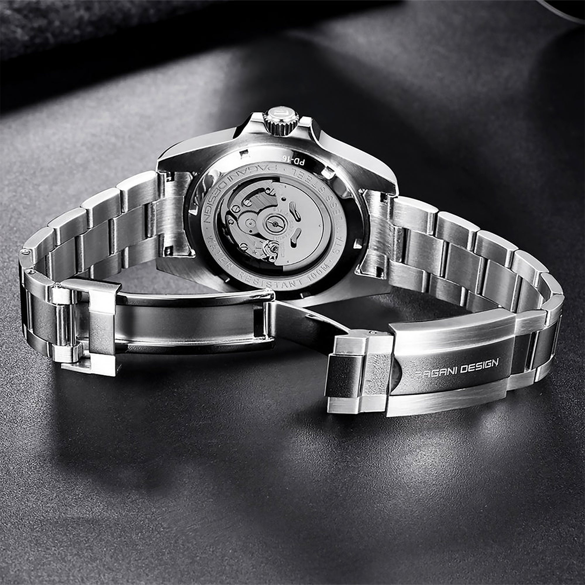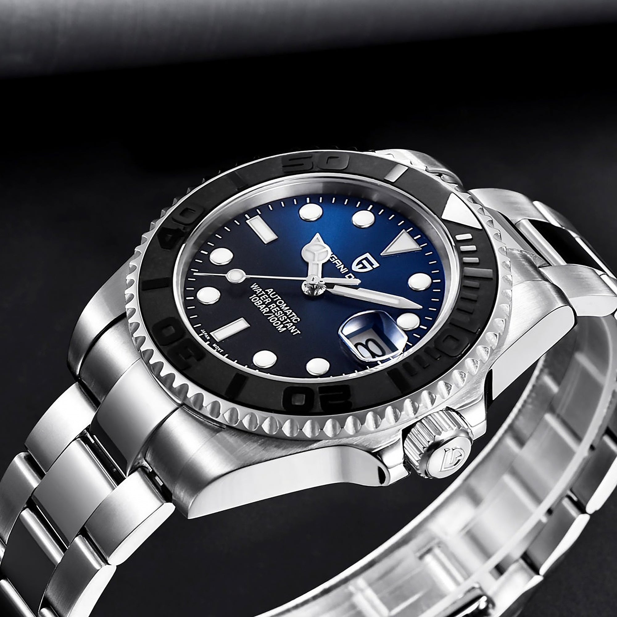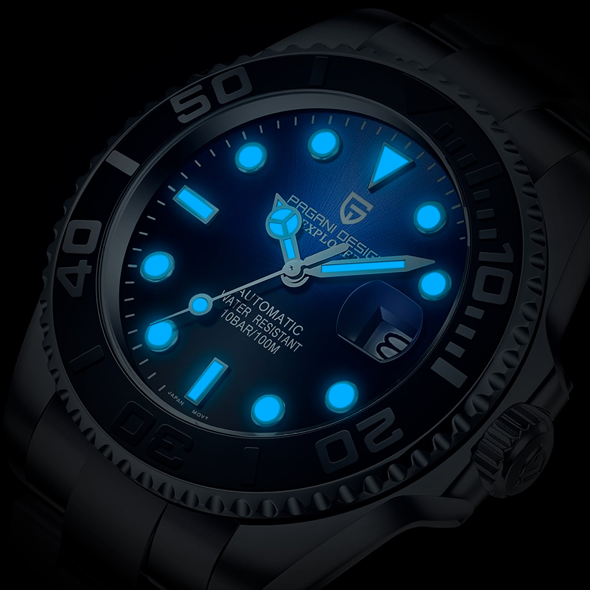 The Pagani Marine features a 40mm stainless steel case and is powered by the reliable Seiko NH35A automatic movement. Designed for precision and durability, it includes a unidirectional rotating bezel and a screw-down crown for added security. The deep, ocean-inspired dial offers excellent legibility with luminous hands and markers. With 100 meters of water resistance, this robust timepiece is equally suited for daily wear and nautical adventures.