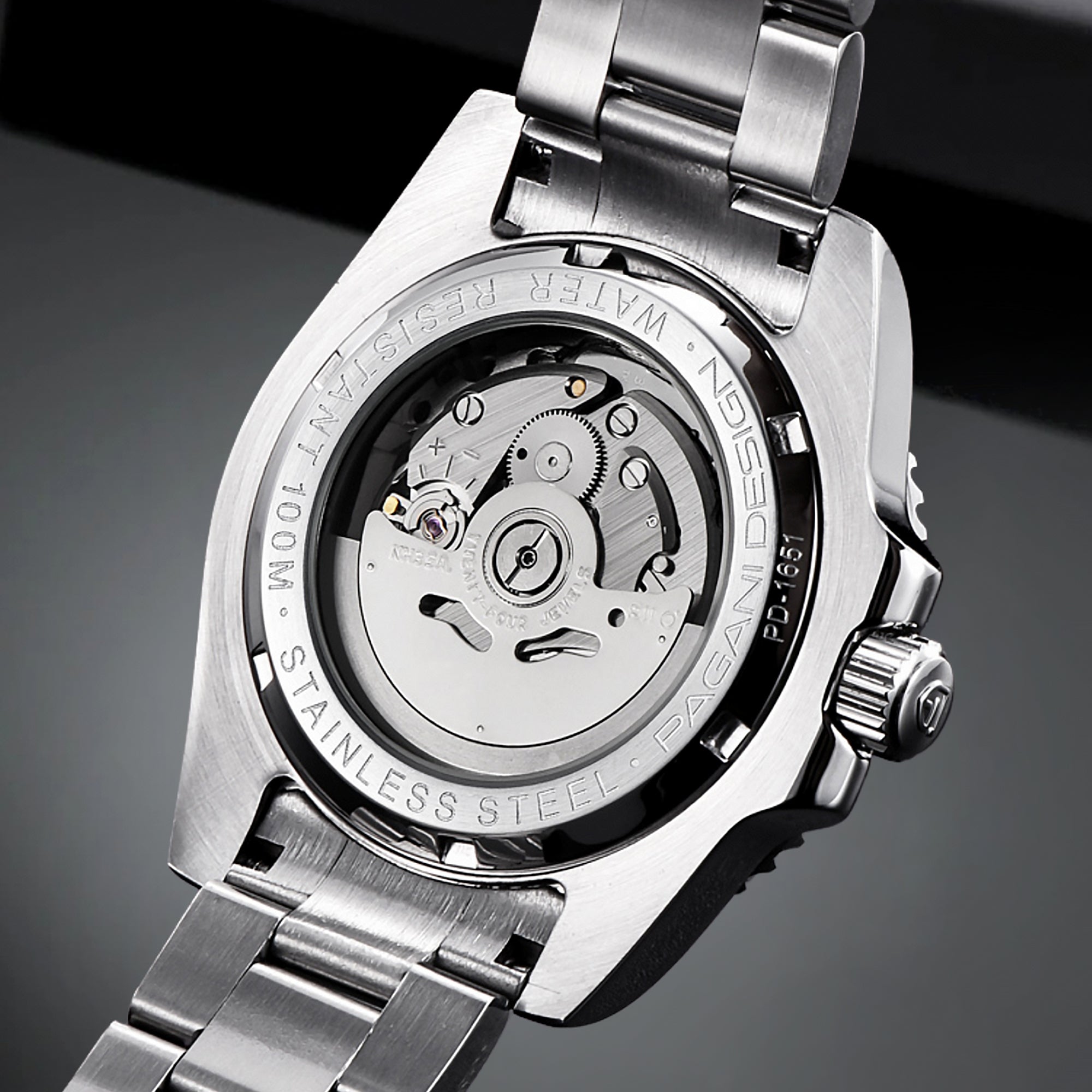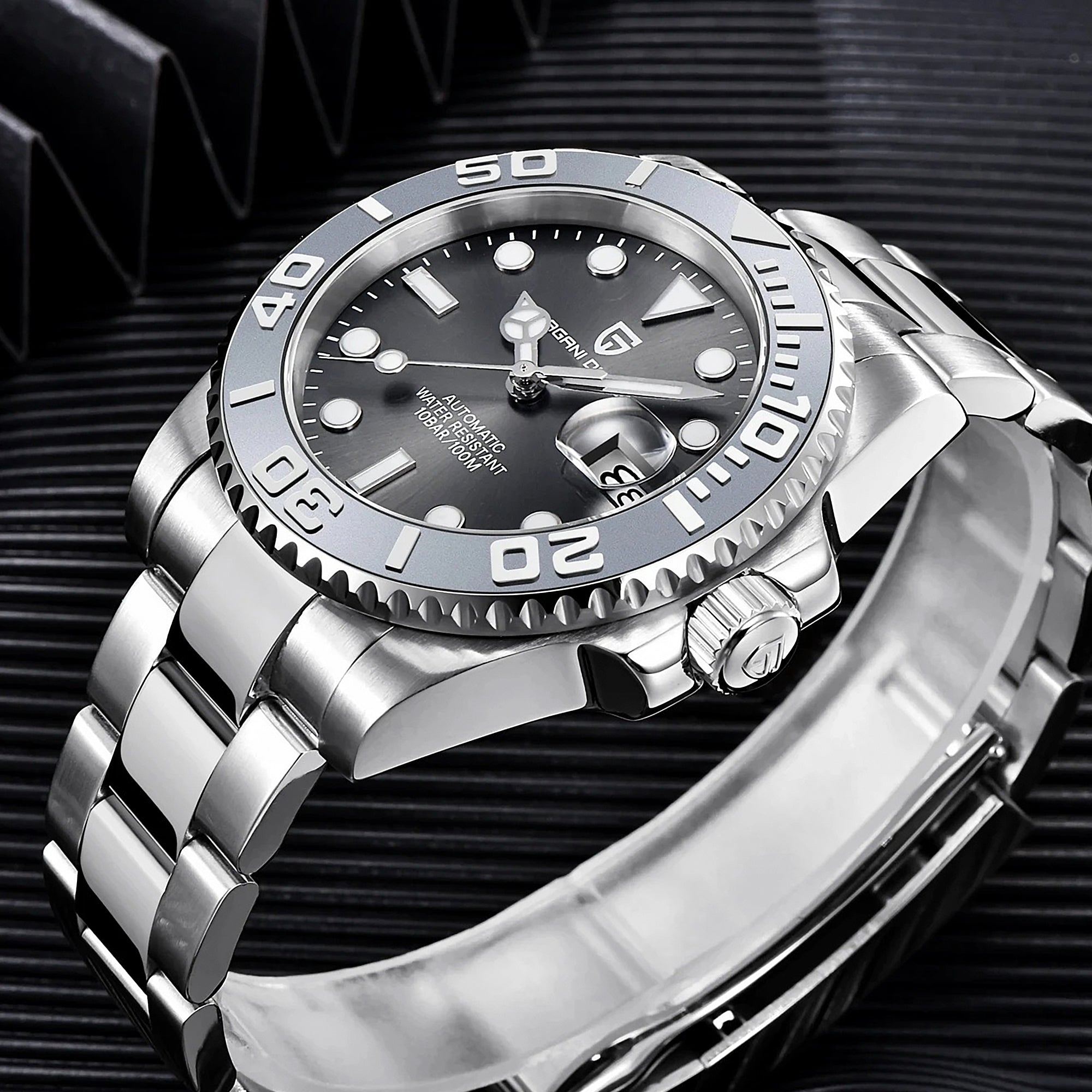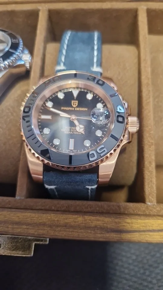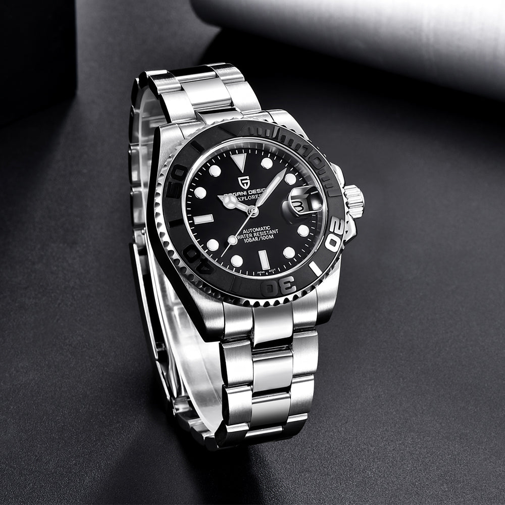 The Pagani Marine features a 40mm stainless steel case and is powered by the reliable Seiko NH35A automatic movement. Designed for precision and durability, it includes a unidirectional rotating bezel and a screw-down crown for added security. The deep, ocean-inspired dial offers excellent legibility with luminous hands and markers. With 100 meters of water resistance, this robust timepiece is equally suited for daily wear and nautical adventures.