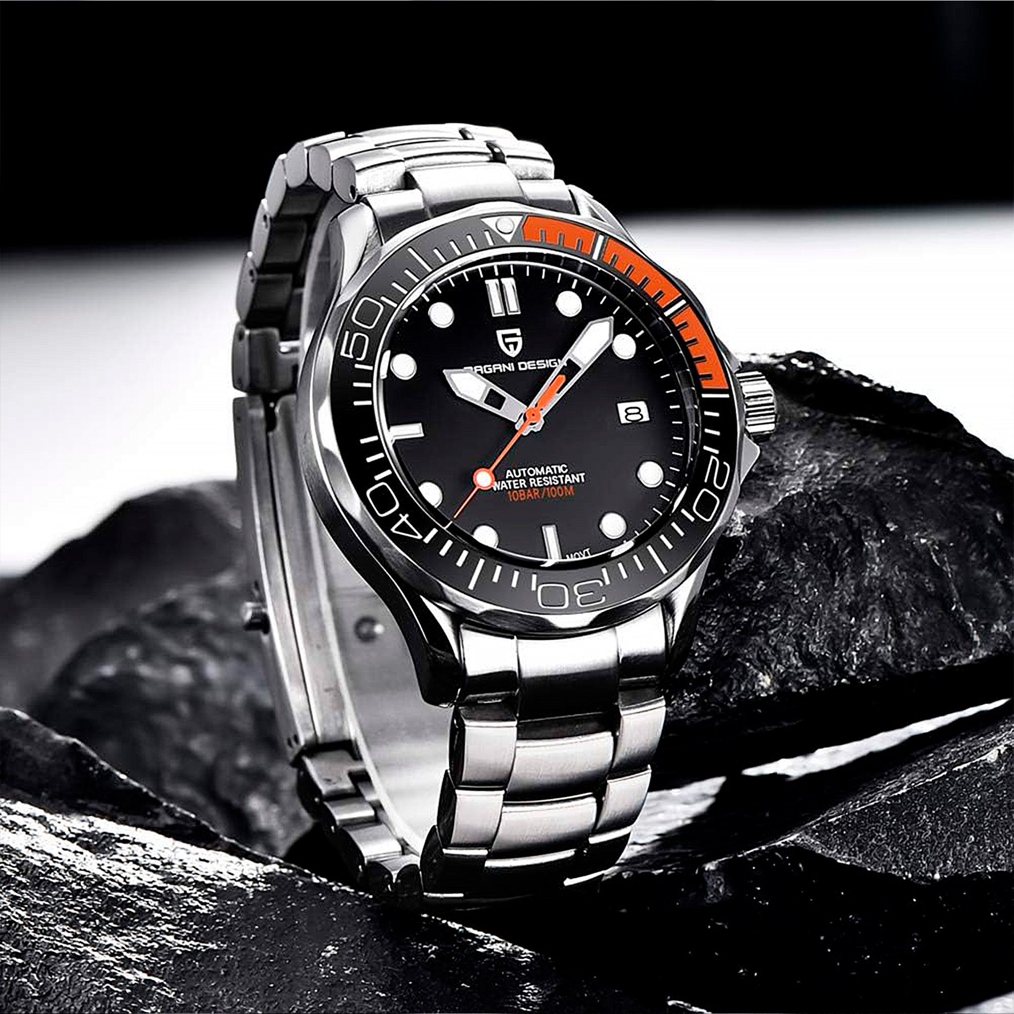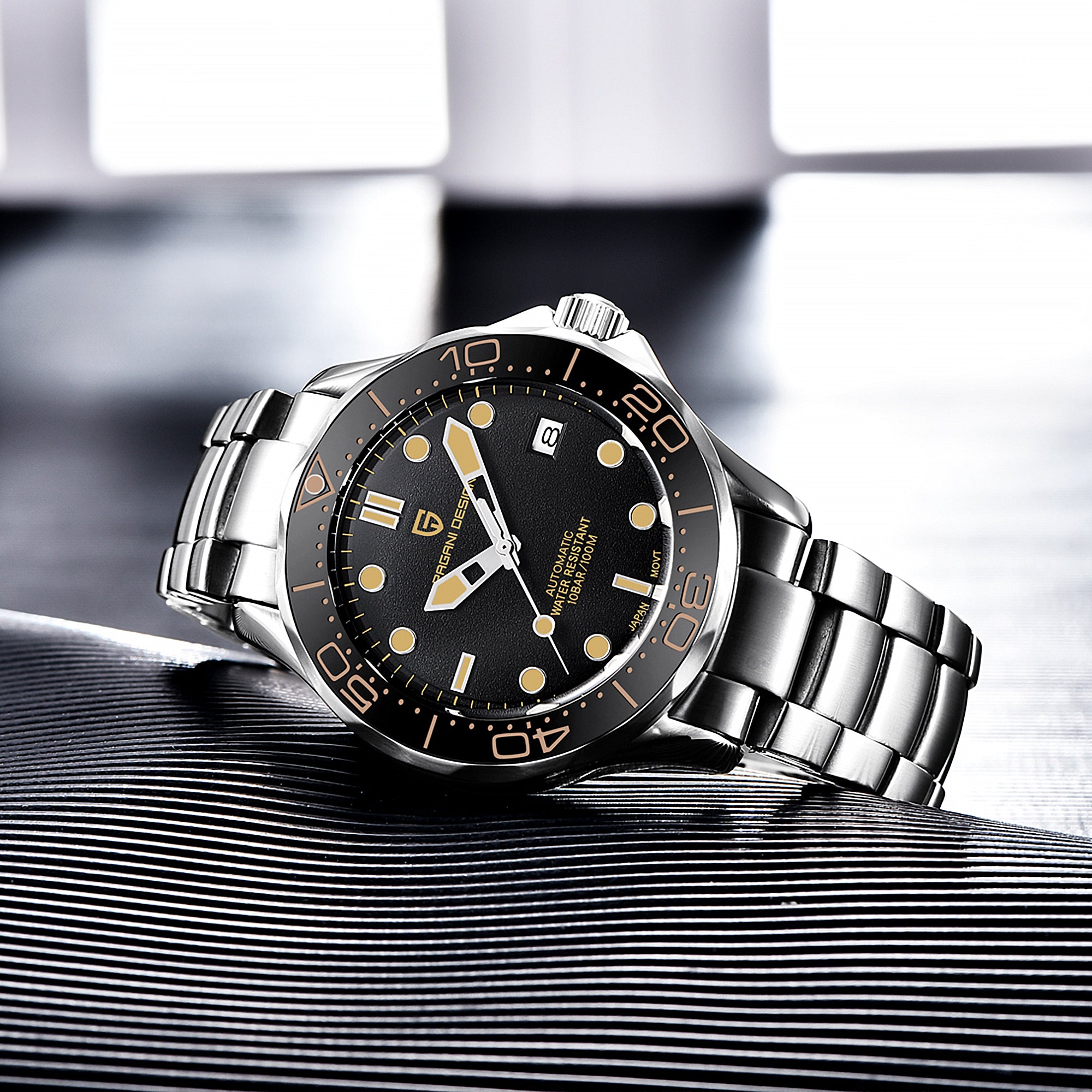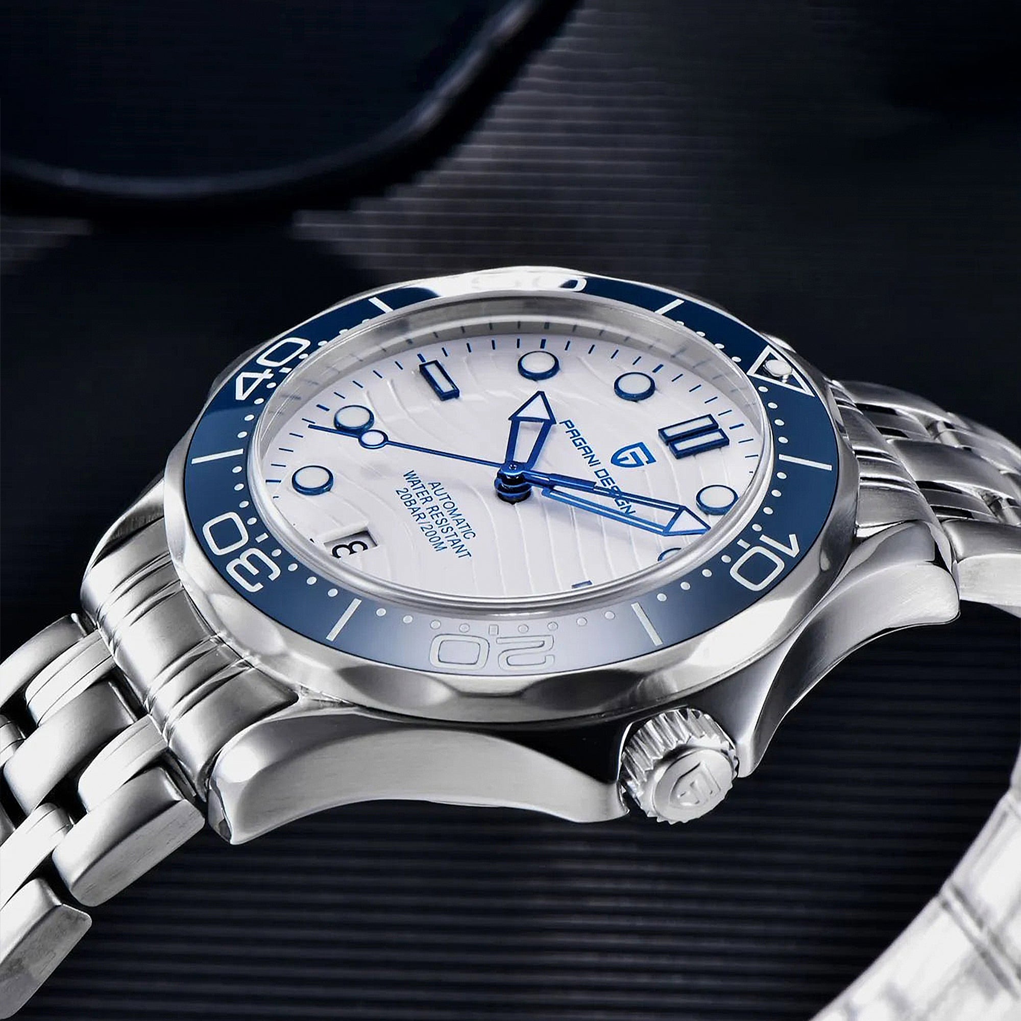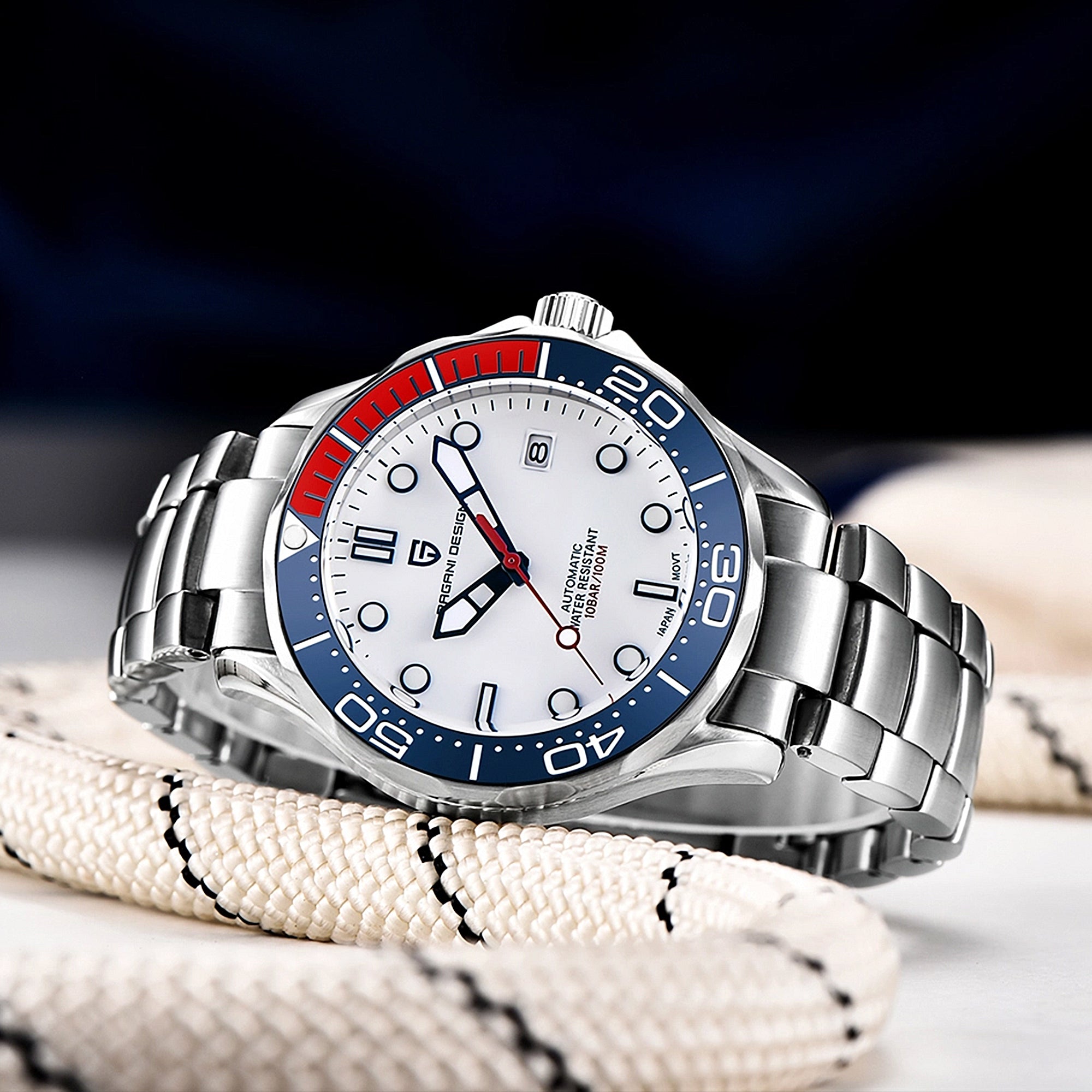 The Pagani Polaris is a modern men’s watch with a 42mm stainless steel case. Powered by a reliable Seiko NH35 Automatic movement, it offers precise timekeeping and smooth operation. The clean dial with luminous hands ensures easy readability. With100 meters water resistance, this sophisticated timepiece is perfect for everyday wear and various water activities.
