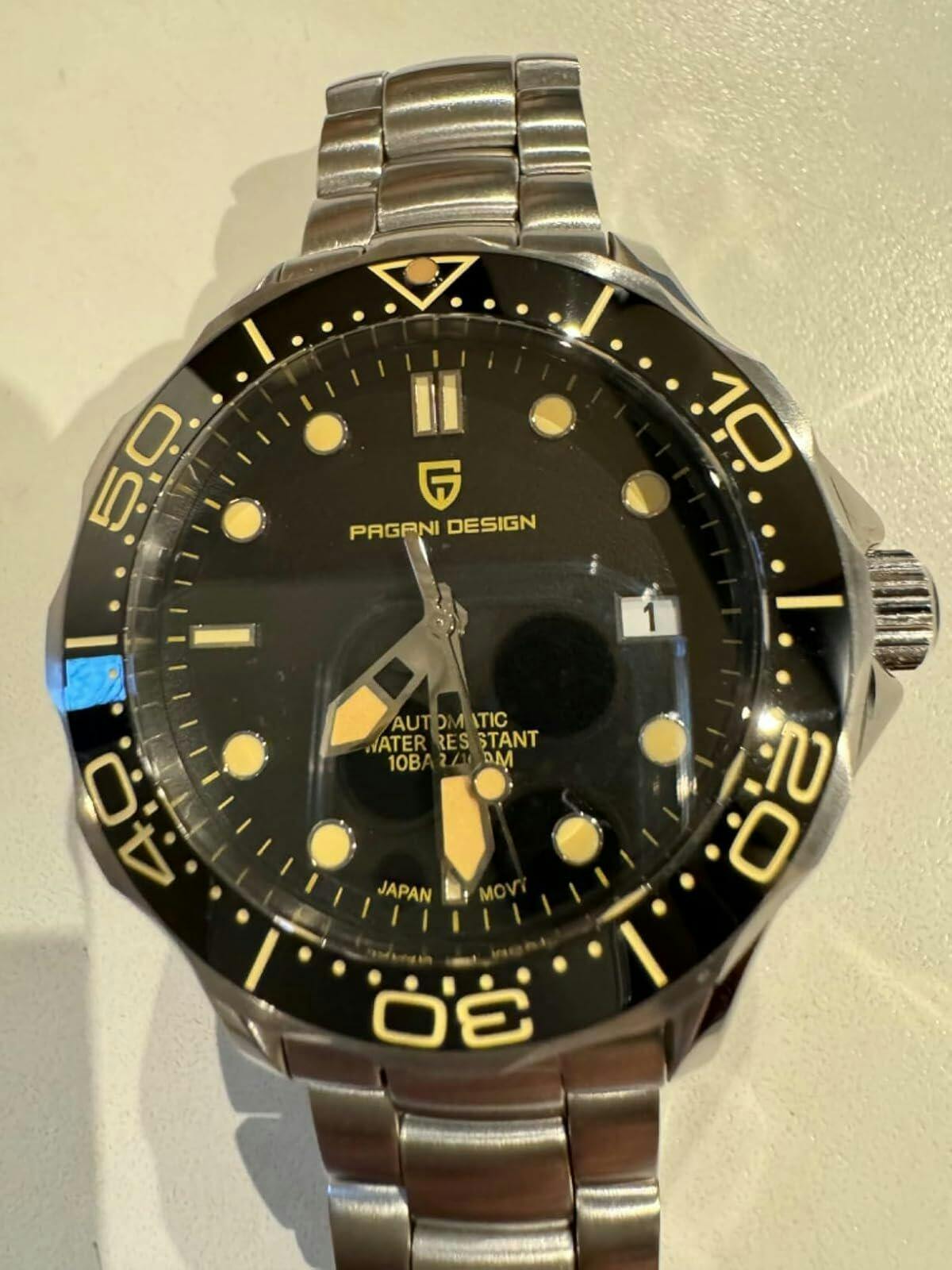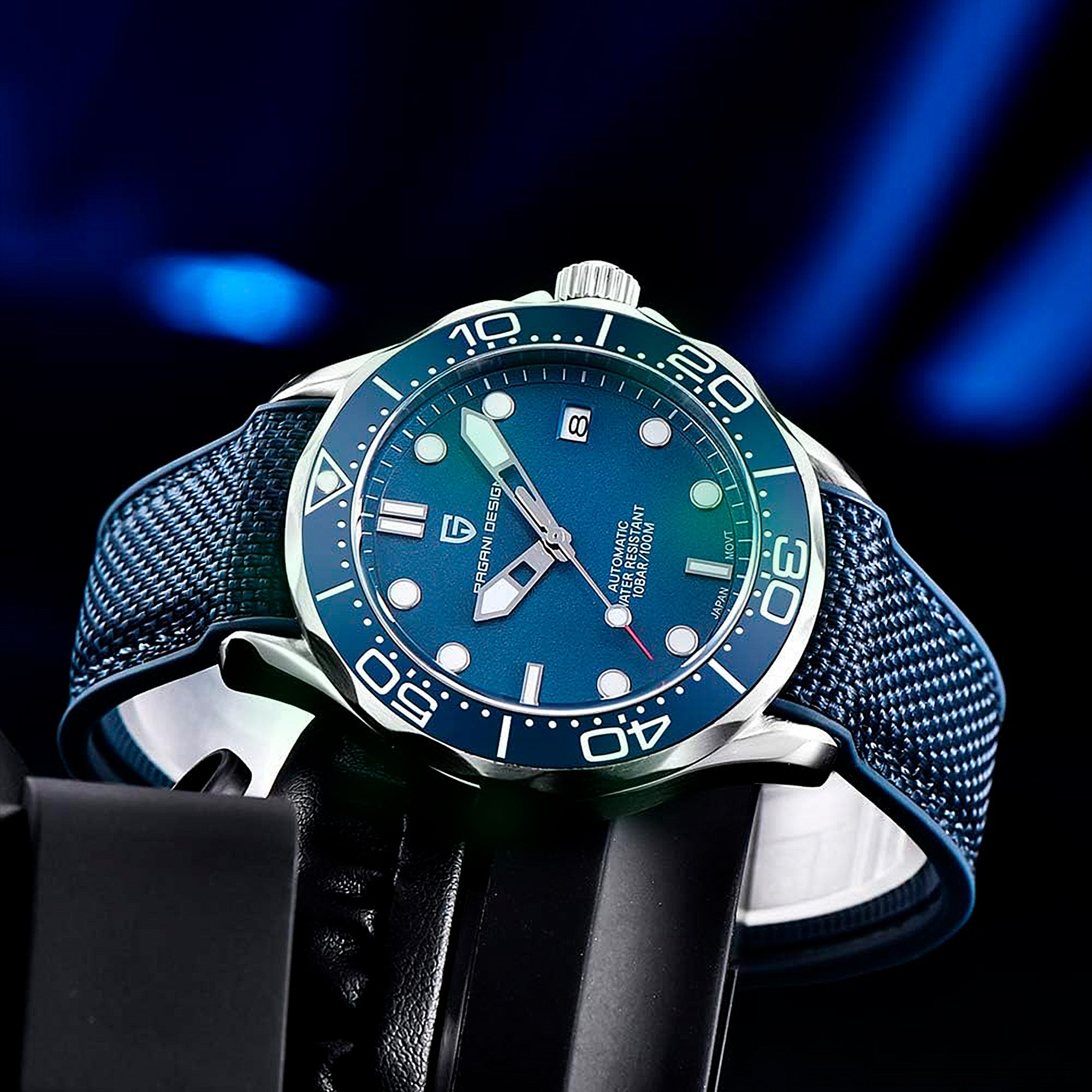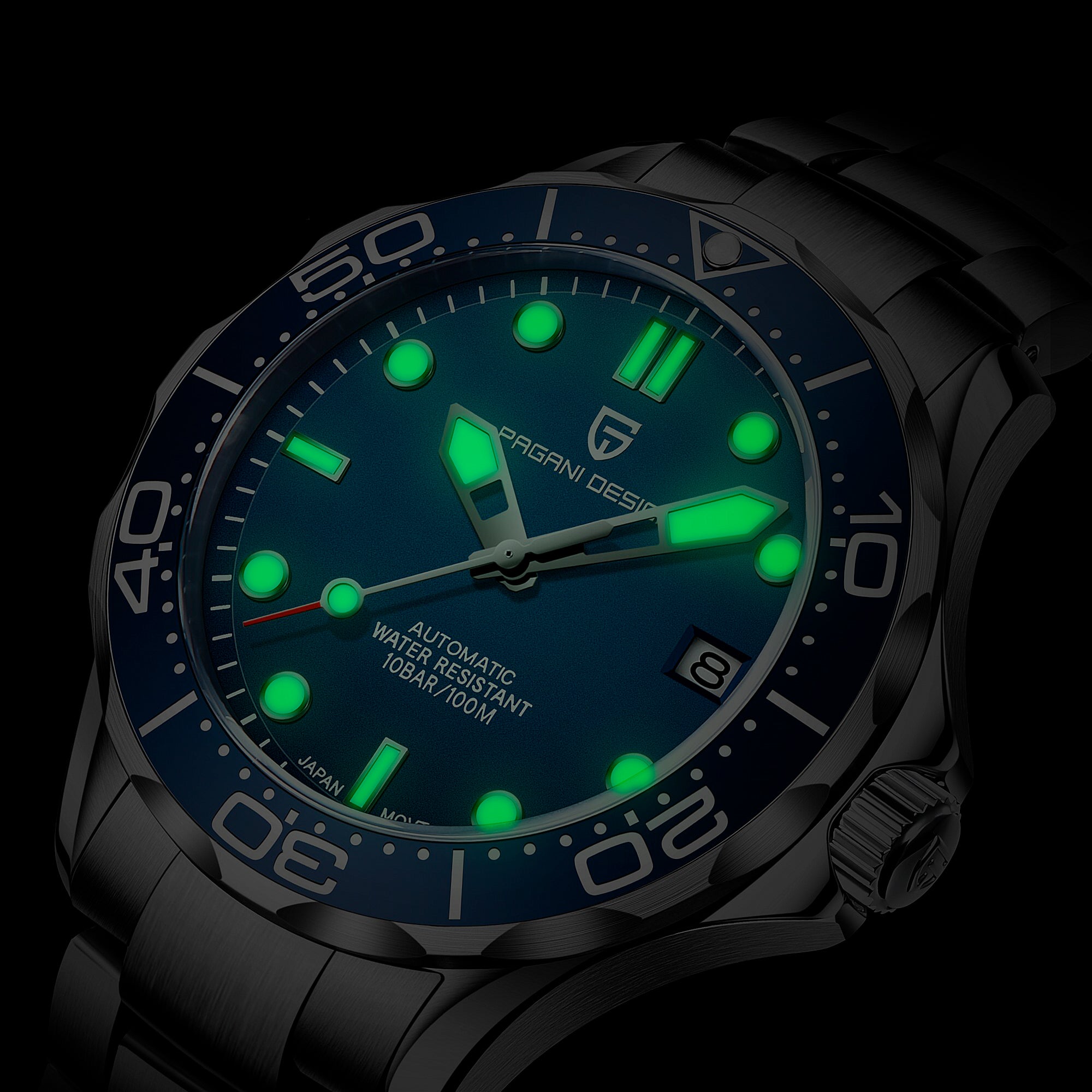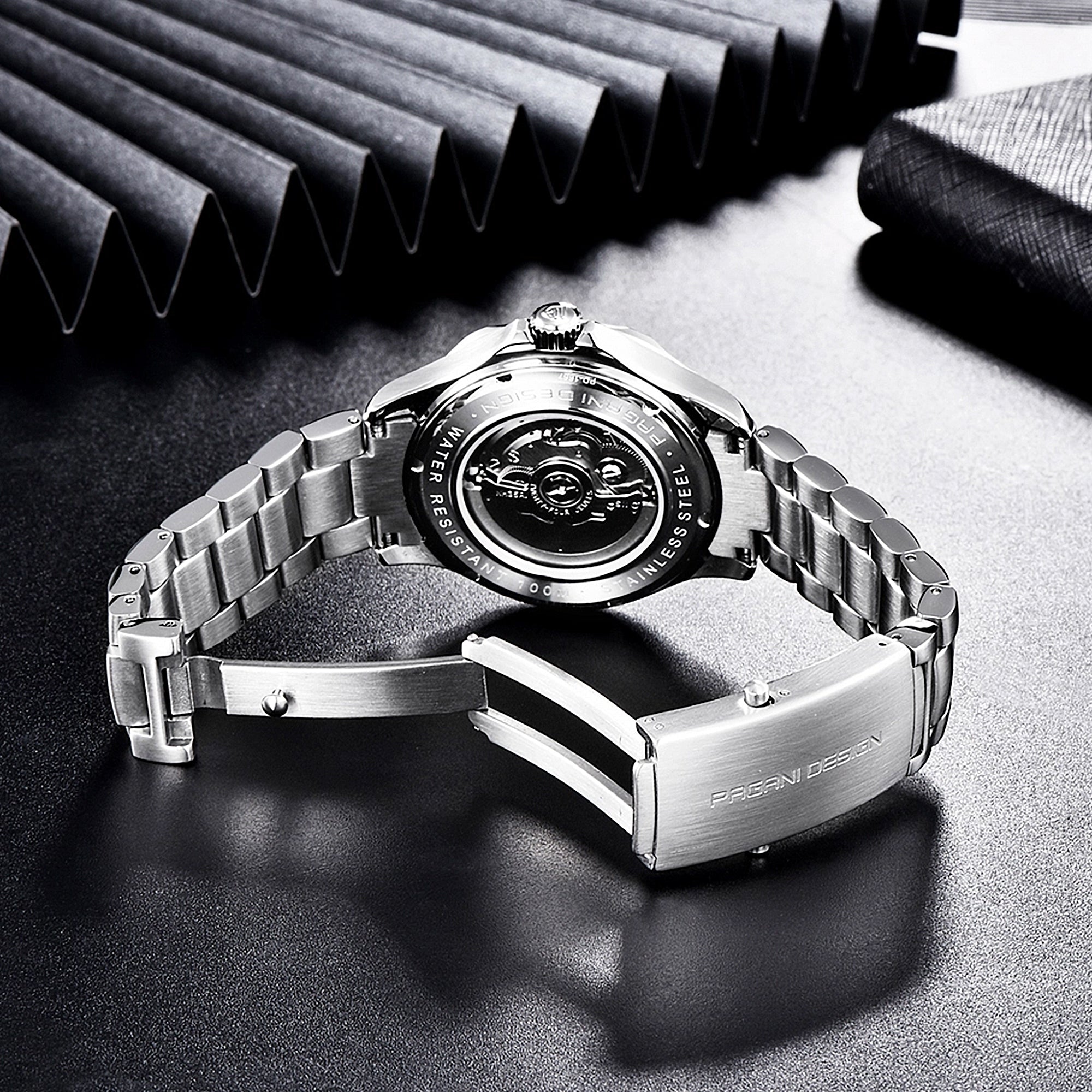 The Pagani Polaris is a modern men’s watch with a 42mm stainless steel case. Powered by a reliable Seiko NH35 Automatic movement, it offers precise timekeeping and smooth operation. The clean dial with luminous hands ensures easy readability. With100 meters water resistance, this sophisticated timepiece is perfect for everyday wear and various water activities.
